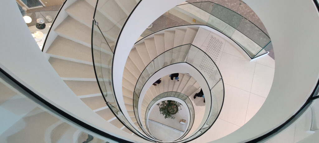 Parmi les chantiers les plus emblématiques de Pol Agret, celui du siège du Crédit Agricole Centre France à Clermont-Ferrand et son escalier monumental en colimaçon (© Pol Agret)